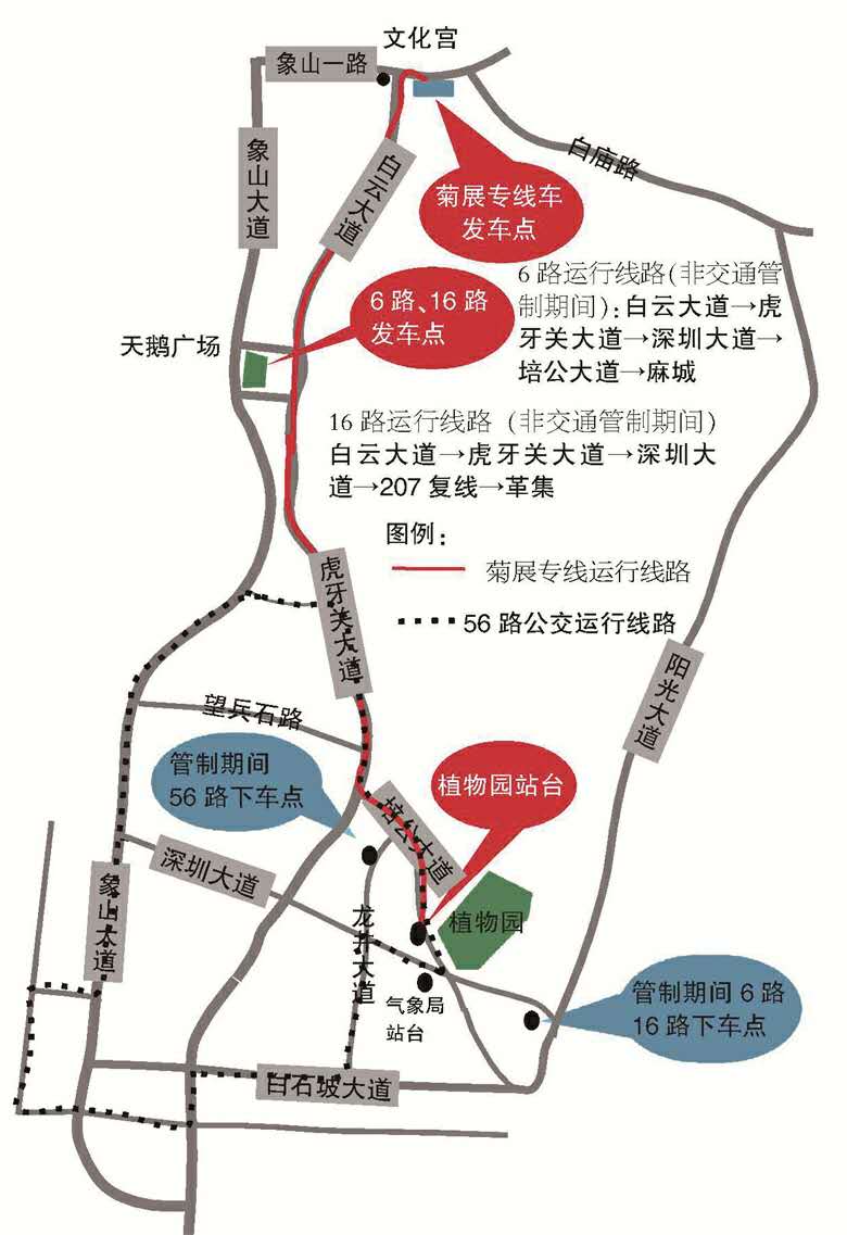 值得說明的是,菊展期間,公交按現(xiàn)行票價收費。菊展前三天,深圳大道東端、培公大道(培公大道與龍井大道交叉路口至培公大道與白石坡大道交叉路口)將實現(xiàn)交通管制,禁止公交車通行,這樣一來,上述四條公交在植物園附近的線路和??空军c將同步調(diào)整,菊展專線公交車將停靠在培公大道植物園出口,其他時間停靠在植物園大門附近的植物園站臺。交通管制期間,16路公交車、6路公交車將??吭诎资麓蟮罇|上下車。56路交通管制期間線路不延伸,在培公大道與龍井大道交叉路口上龍井大道,游客可在龍井大道北段上下。荊門晚報訊(記者戴永君)