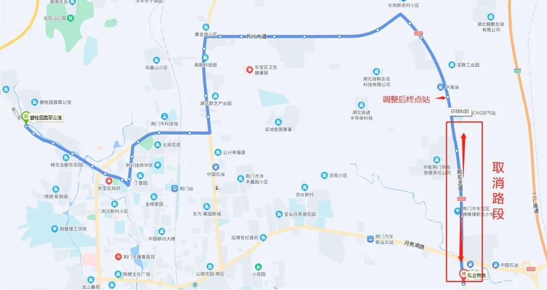 具體為:碧桂園翡翠公館—宏業(yè)物流調(diào)整為碧桂園翡翠公館—環(huán)球科陽(荊東大道),暫時取消荊東大道與長崗一路交匯處—宏業(yè)物流區(qū)間路段(具體走向圖見附件)。道路施工結束后即恢復原線路運行。